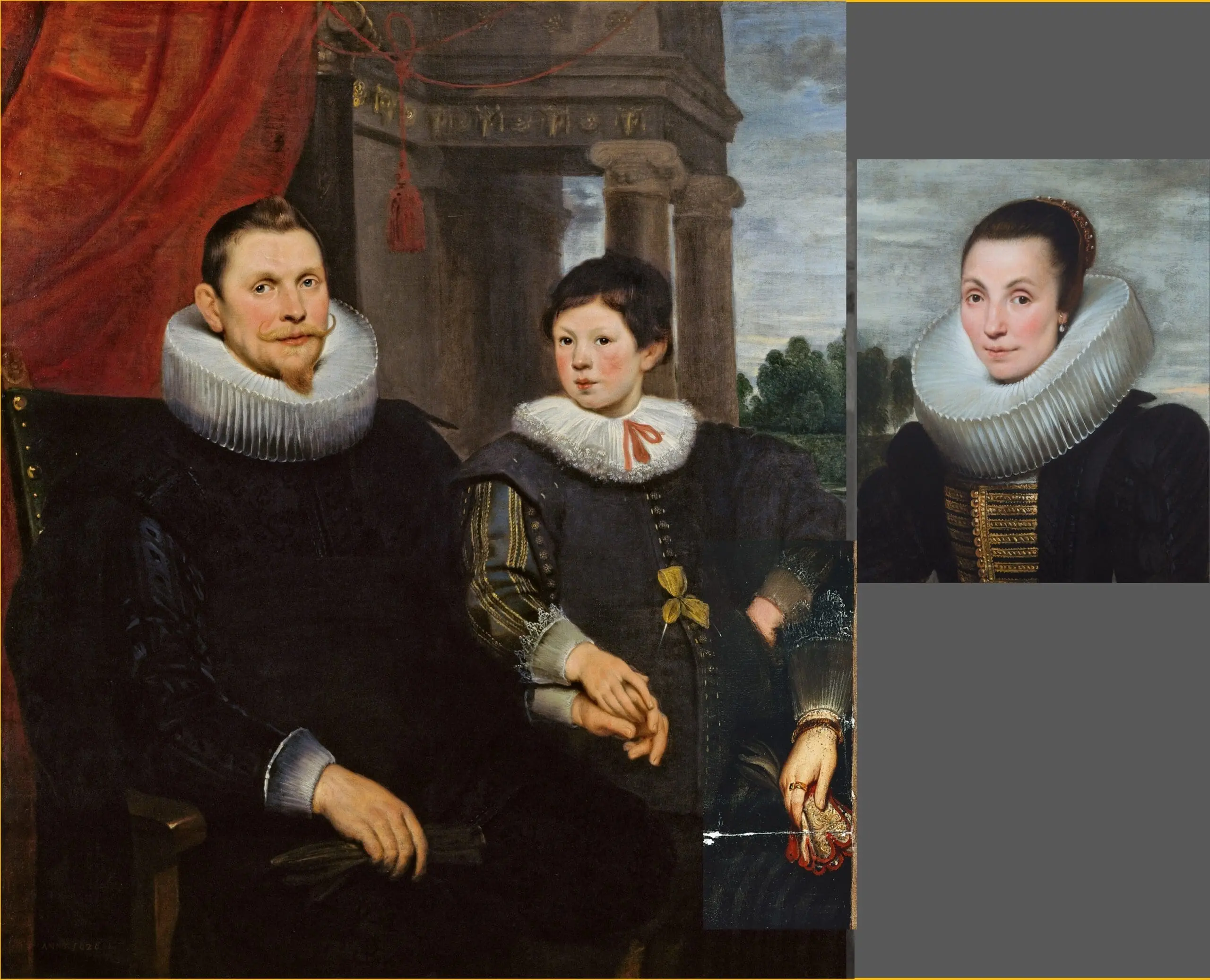 The portraits in their present state contain no heraldic weapon or references to the identification of the family, so I have been searching for clues for the family’s identity in the painting’s provenance. In 1802, a ‘A Family Picture of three Portraits by de Vos’ was auctioned in London. This painting appears at several different auctions from 1812 to 1830 in England, and we have reasons to assume that this is de Vos’ painting before it was cut down in two separate pieces. These later auctions describe the work as ’A Burgomaster, his Wife, and Son by De Vos’. Is this merely an interpretation of the auctioneer, or did the lost upper and lower right corners of the canvas contain an inscription? In any case, the ruling elite is exactly the type of clientele one would expect for a monumental family portrait by the sough-after portrait painter De Vos! We see the family’s wealth and influence reflected in their rich clothes and the lady’s golden jewelry. My research into the identity of the family is ongoing and I’m sure that, with a bit of luck, this mystery will be solved in near future.