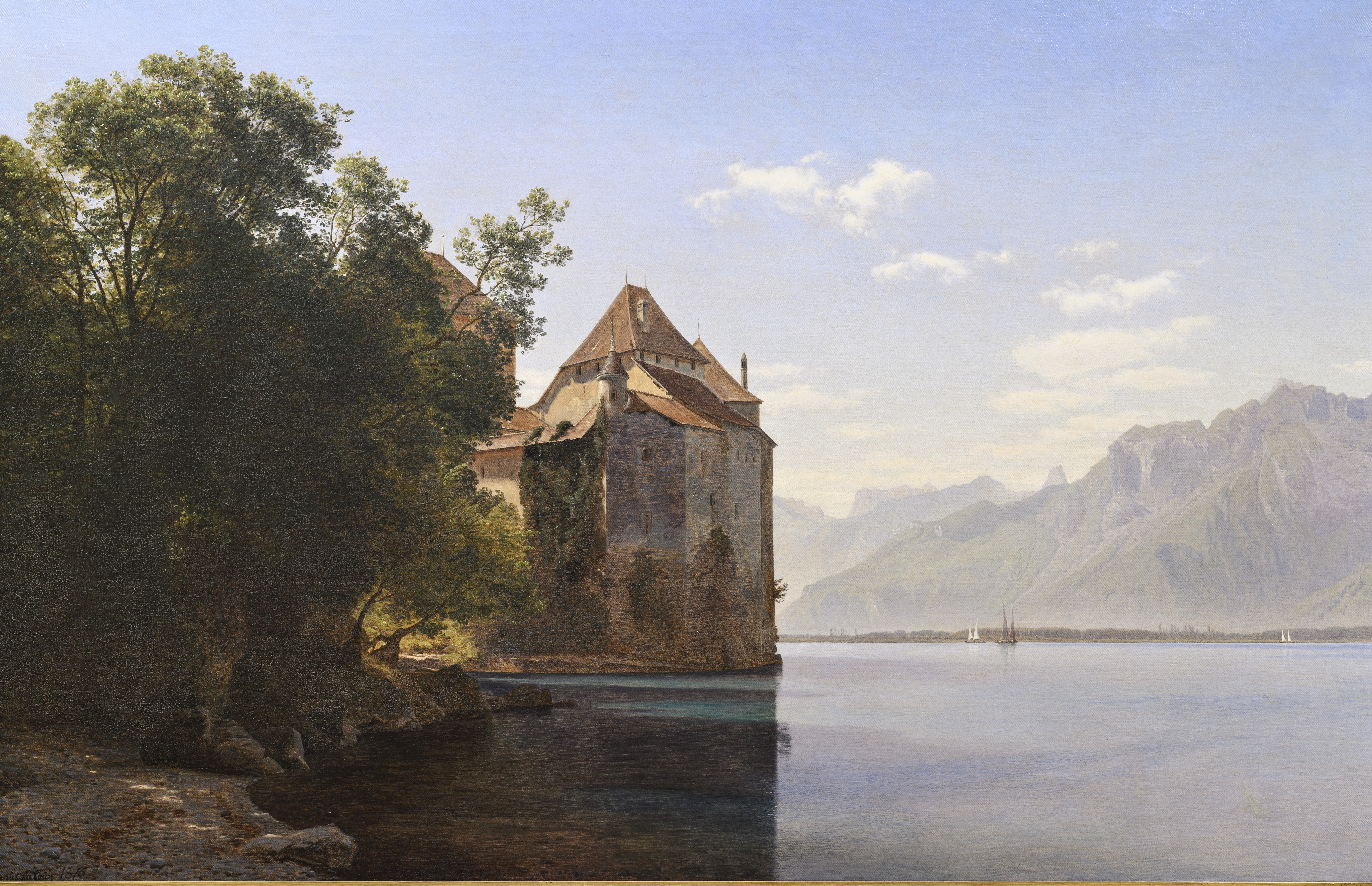 En uforstyrret stilhed kendetegner Janus la Cours landskabsmaleri fra Schweiz. Motivet er hentet fra en af kunstnerens vandringsture til Genfersøen en tidlig september morgen. På en klippeø ud til den spejlblanke sø ses bagsiden af middelalderslottet Chillon, mens klippeformationer i horisonten anes gennem den tætte morgendis. Det mennesketomme landskab vidner om, at kunstneren ikke har været interesseret i samtidens folkeliv, men derimod i den eksotiske naturs mangfoldige udtryk. Den varme og dybe farvenuance som kendetegner vegetationen i forgrunden står i skarp kontrast til den næsten transparente farvepalet som udgør vandet og de sneklædte bjerge i horisonten. Mødet med den schweiziske natur blev en stor oplevelse for Janus la Cour, der under sit ophold skrev begejstret om landskabets særegne skyformationer, monumentale bjerge og fredfyldte dale.