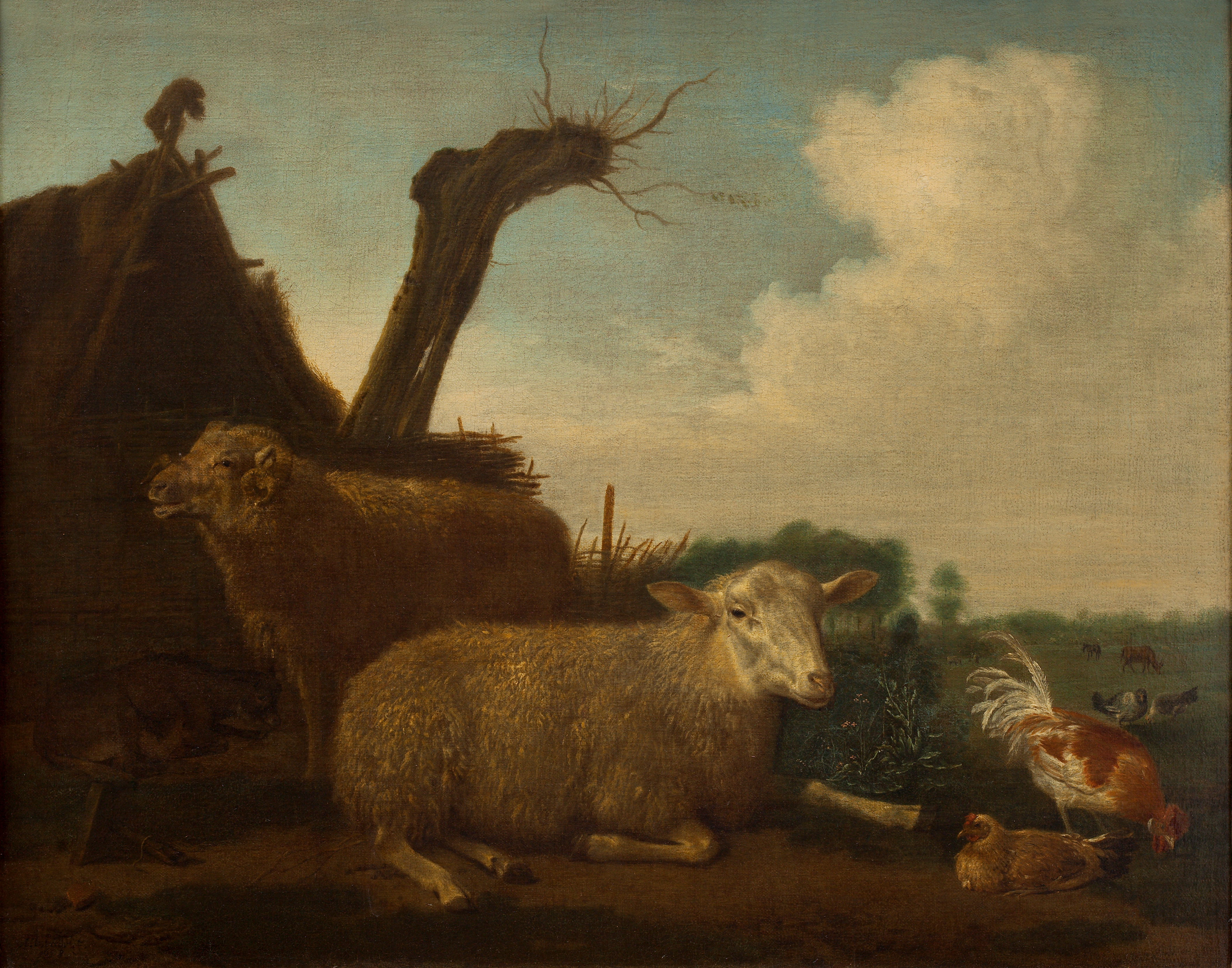 Hollandsk landskab med får, vædder, ged og fjerkræ foran en hytte, 1658