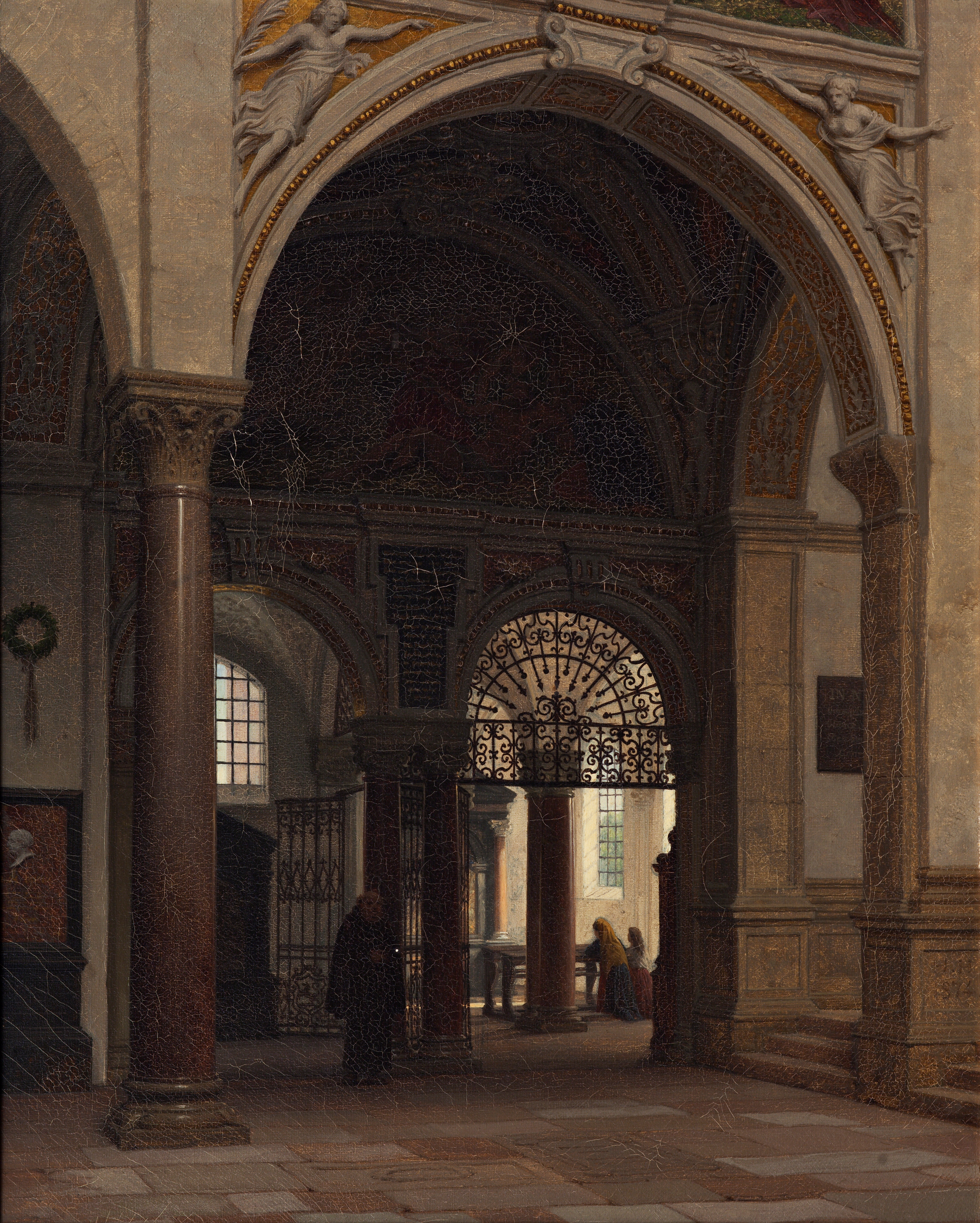 Arkitekturstudiet fra det indre af Santa Maria delle Grazie kirken i Milano har Heinrich Hansen ikke blot registreret klosterkirkens arkitektoniske træk, men også interesseret sig for at indfange det varierende lysindfald og dets indvirkning på rummet. En munk er lige trådt ind i det monumentale kirkerum, mens to kvinder beder foran et alter i et lille sidekapel. Kunstneren har omhyggeligt skildret, solskinnet der falder ind gennem ruderne og oplyser det lille sidekapel samt de to kvinder i bøn. Det varme lysindfald står som en afbalanceret modvægt til det mørke indgangsparti, hvor munken befinder sig. Denne harmoniske relation mellem kolde og varme nuancer afspejles i den rolige og kontemplative tilstand, som både den kutteklædte munk og kirkegængerne befinder sig i.