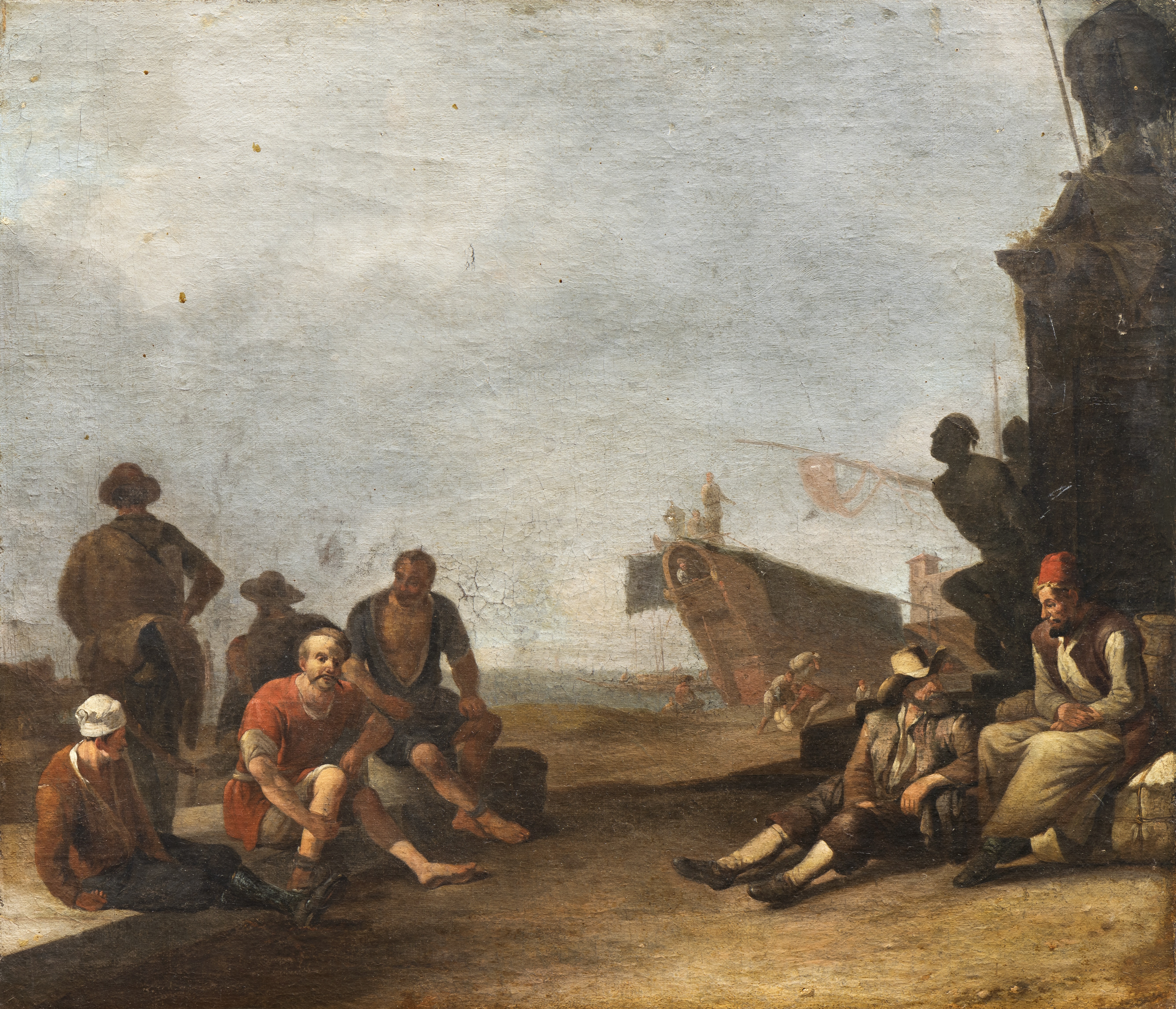 Lingelbachs værk viser en scene i Livornos havn, som kan genkendes ud fra statuen af Ferdinand I de Medici til højre i billedet. Lingelbach besøgte Livorno på sin rejse til Rom, hvor han tog skitser af havnen. Skitserne brugte Lingelbach gennem resten af sin karriere, hvor han adskillige gange malede Livornos havn. På dette billede ses to fanger i fodlænker til venstre, og i højre side af billedet sidder købmænd på vejen og på pakket gods i samtale, mens de venter på skibets afgang.