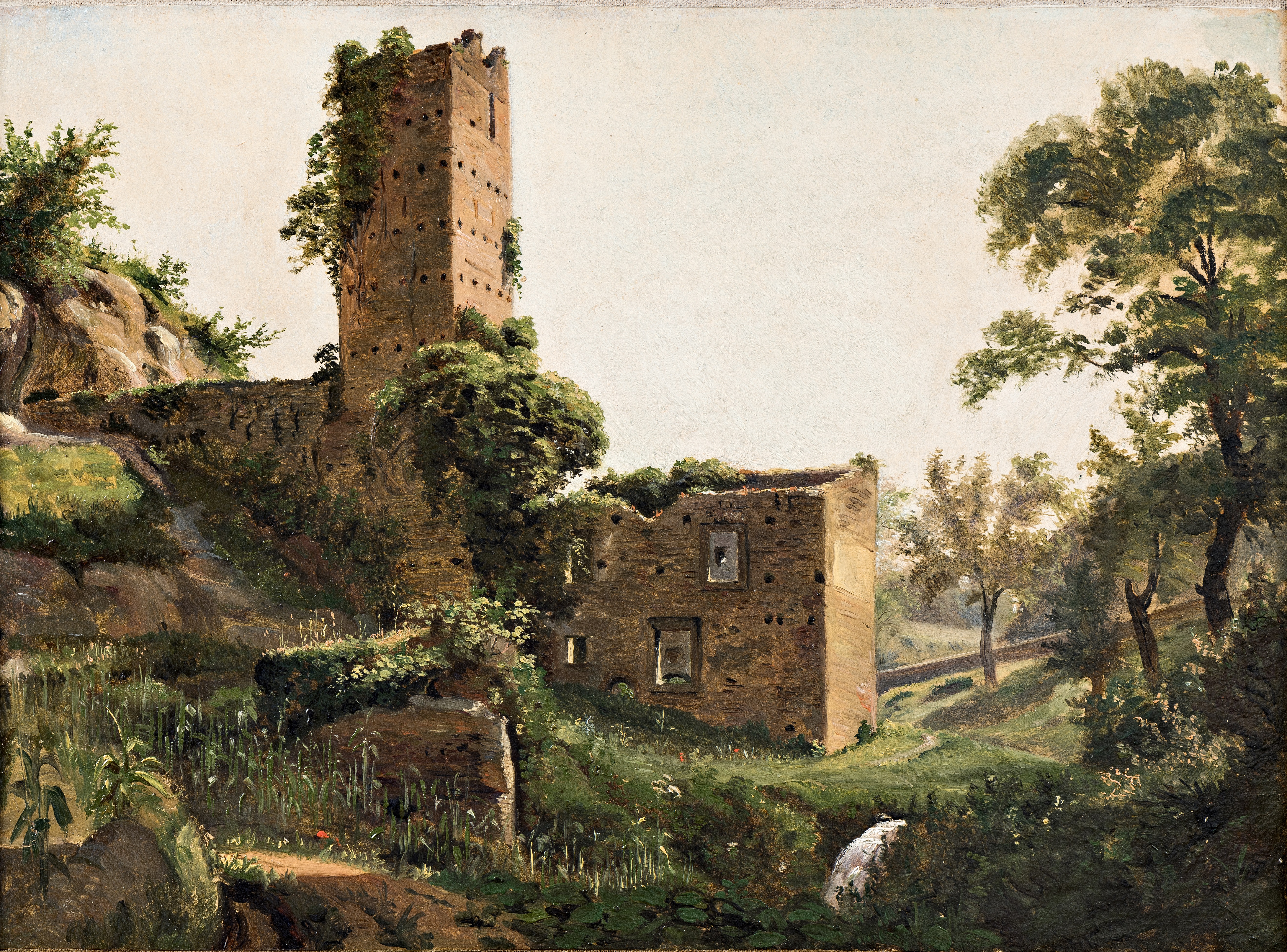 Ved ankomsten til Rom havde Wilhelm Marstrand svært ved at påbegynde arbejdet. I håbet om at finde inspiration tog han alene ud i bjergene uden for byen og begyndte her at udføre studier til en altertavle. Dette landskabsmotiv er sandsynligvis udført under turen. Med dets dekorative kvaliteter ville motivet være oplagt som baggrund i et religiøst motiv. Kunstneren har med få hastige penselstrøg antydet den frodige vegetation i forgrunden, hvis skinnende overflade understreges af det intense sydlandske lys. Længere tilbage tårner en tilvokset ruin sig op i et bakket landskab. I den pittoreske gengivelse af landskab og ruin trækker motivet tråde tilbage til den franske kunstner Claude Lorrain og dennes landskaber fra Italien.