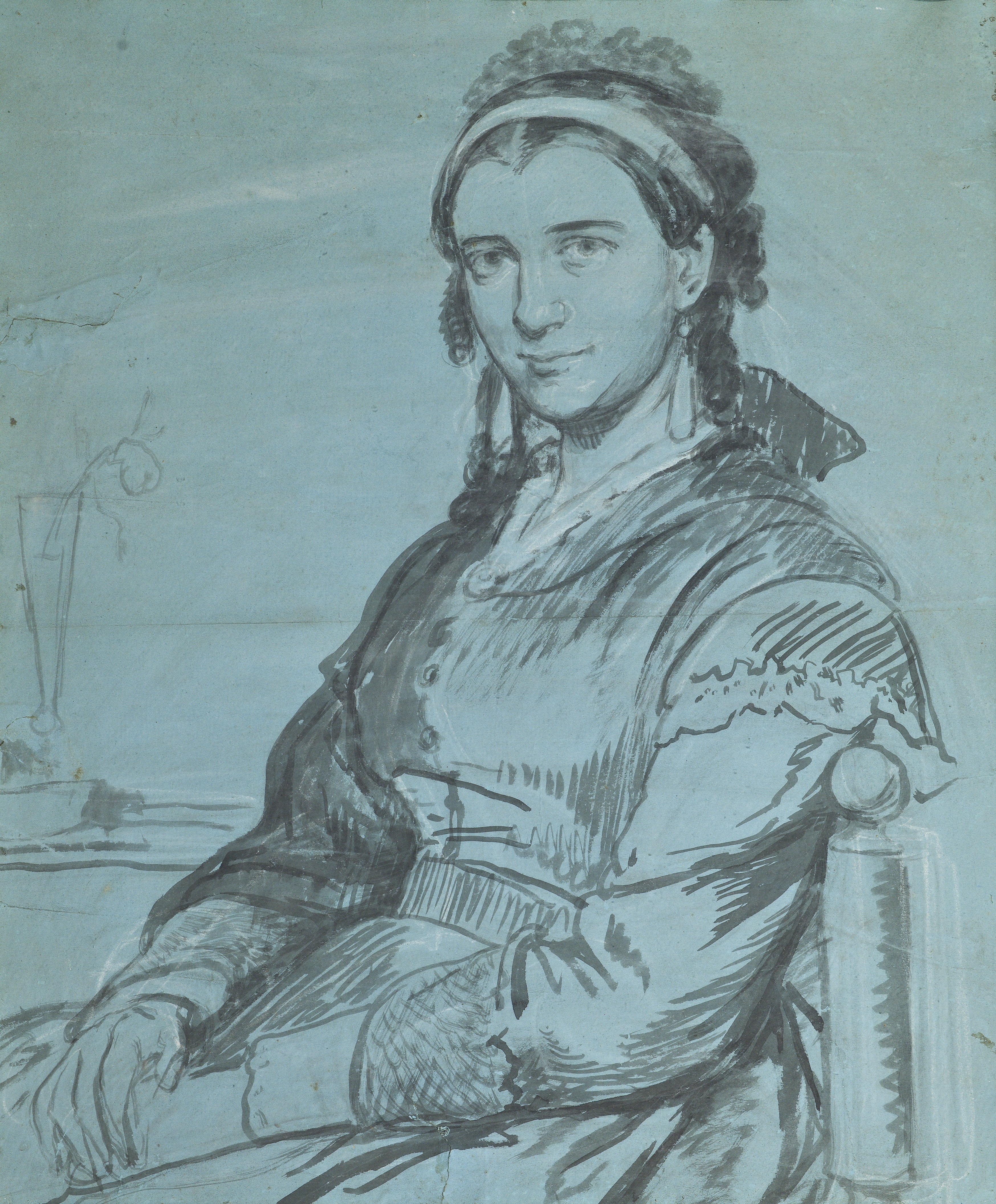 Blyant, tusch og hvidkridt på blåt papir, 68 x 57 cm.