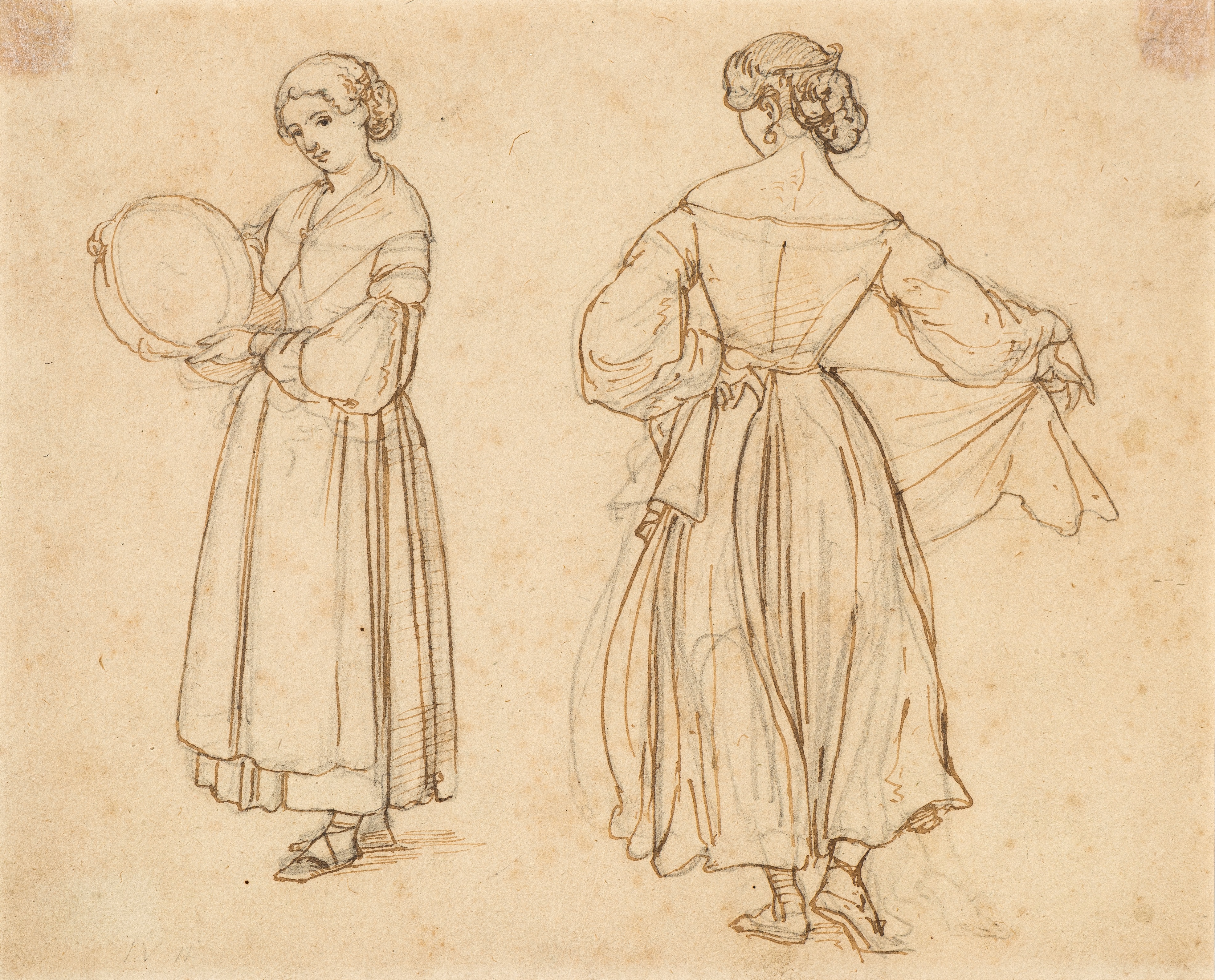 I en fin, lille skitse, har Marstrand tegnet den centrale, kvindelige danser og tamburinspilleren i det store maleri Romerske borgere forsamlet til lystighed i et Osteri, der også tilhører Nivaagaards Malerisamling. Først har han skitseret dem med fri hånd og blød blyantsstreg, derefter er de tegnet op med pen. På blyantskitsen ses det, at Marstrand forsøgsvis har tegnet danserindens fod i flere forskellige positioner, blandt andet den yderste, som han efterfølgende overførte til maleriet. Marstrand er måske den af guldaldermalerne, fra hvem vi har flest tegninger overleveret. Der findes en lang række studier, skitser og færdige tegninger fra hans hånd. Mange er dem kan betragtes som små, selvstændige kunstværker i egen ret. Denne skitse af de to kvinder har været brugt som et redskab i arbejdsprocessen med at opbygge motivet i maleriet og bestemme de forskellige figurers stillinger og bevægelser.