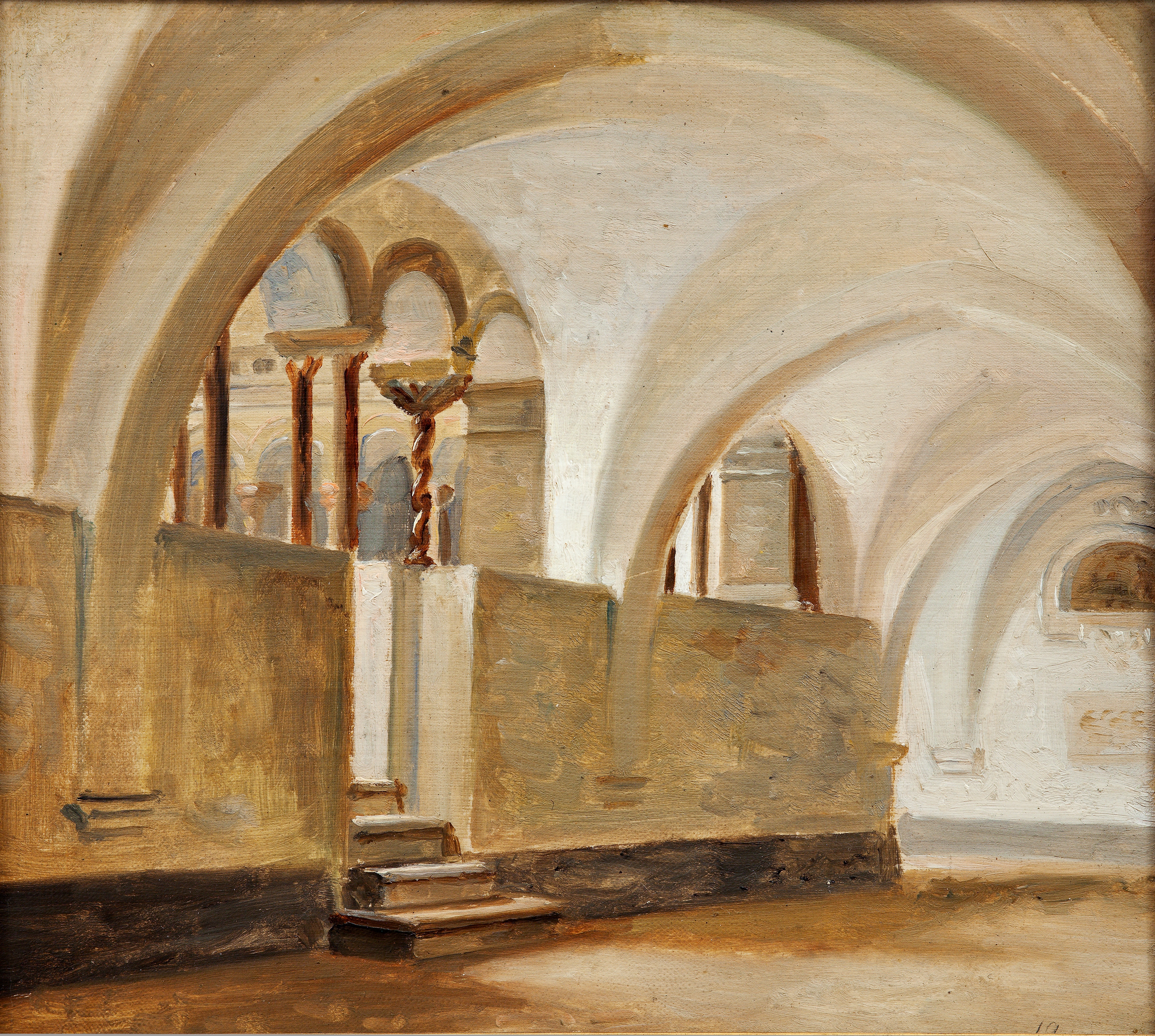 Dette lille maleri fra klostret Santa Scolastica i byen Subiaco øst for Rom bærer tydeligt præg af at være blevet malet på stedet, foran motivet. Nogle steder er penselstrøgene pastose, andre steder er de mere transparente, og dele af motivet har skitsens karakter. Studiet er fra den inderste, ældste klostergård med de graciøse romanske søjler, der er skiftevis glatte og snoede. Roed har været interesseret i, hvordan lys og skygge har skabt dynamiske skift i rumfornemmelsen, og har med fine, lyse nuancer i paletten gengivet det lave, hvide rums strukturer. Hans interesse for arkitekturmaleriet og elevtiden hos C.W. Eckersberg, ligger som en undertone i den nøgternt observerende tilgang til motivet. Men samtidig er der i dette studie en blødhed, der ikke findes i Eckersbergs maleri.