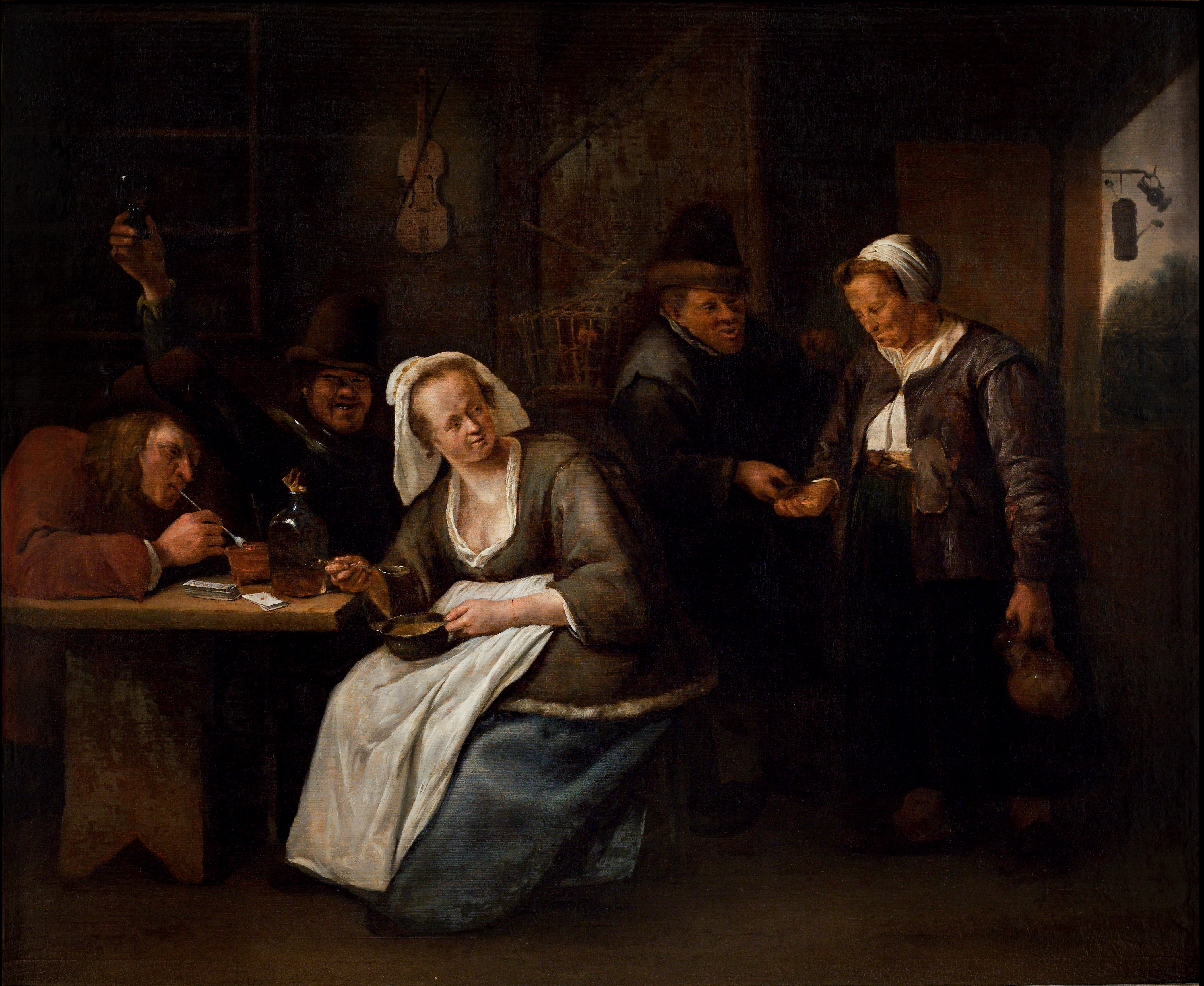 Indenfor i det dunkle værtshus er en gruppe mennesker samlet. Rundt om bordet sidder en bonde, en soldat, der løfter sit glas højt i vejret, og en trind, ung kvinde klædt i en grøn kofte kantet med skind. Ved siden af bordet står værtinden med tunge, ludende skuldre og tager imod penge fra en lavstammet bonde med en høne i et bur, som han bærer over skulderen. De trinde, plumpe figurtyper med store hoveder og små, udtryksfulde ansigter er karakteristiske for Jan Steens genrebilleder med motiver fra hjemlige interiører, eller som her kro- og værtshusscener. Maleriet rummer en høj grad af detaljerealisme, som for eksempel gengivelsen af glasset og glasflasken, skeen, piben og violinen på muren bag figurerne. På muren over bonden med hønen i bur har kunstneren signeret maleriet ”Steen”.
