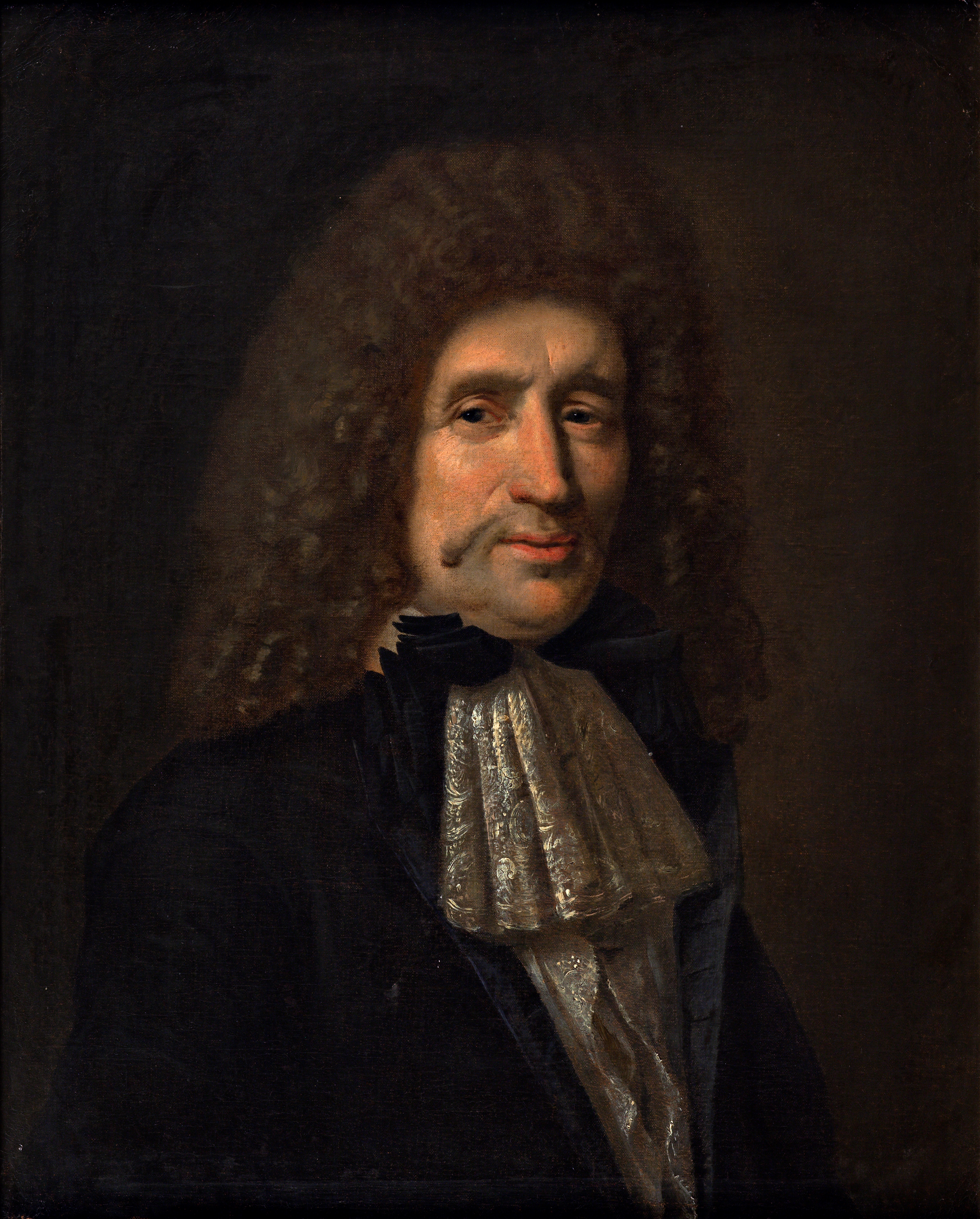 En midaldrende herre med paryk, kravat og et markant overskæg betragter beskueren med et underfundigt og tvetydigt smil. Han er portrætteret i en nedtonet stil og med en mørkstemt farveholdning, der kun brydes af enkelte lyse detaljer. Selvom identiteten på manden er ukendt, røber den elegante tøjstil, at han fulgte det franske modebillede, som herskede blandt det velstillede europæiske borgerskab i slutningen af 1600-tallet.