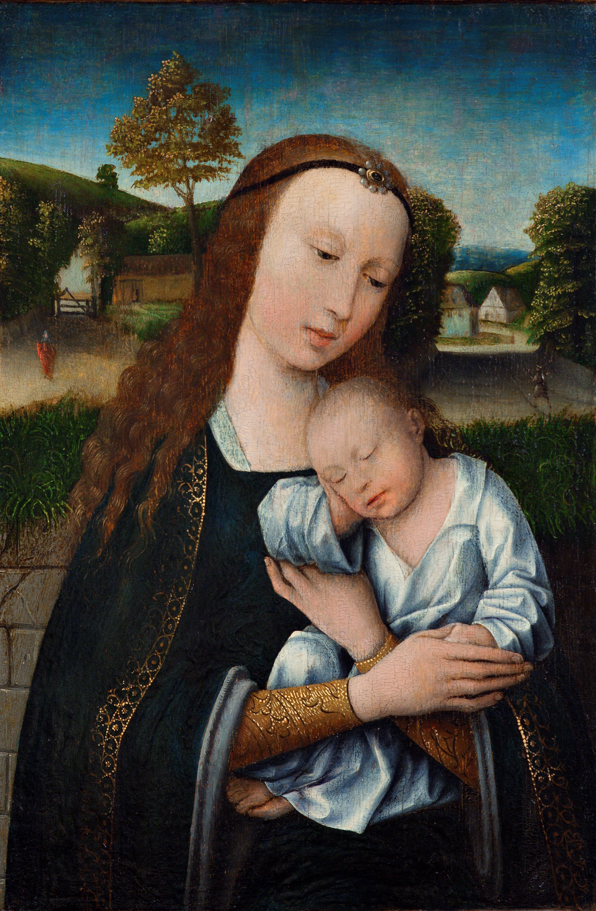 En salig Jomfru Maria holder det sovende Kristusbarn trygt i sine arme. Hendes hoved er let sænket og over panden bærer hun et sort bånd med et perlesmykke. En stenmur afskærer familien fra et idyllisk landskab i baggrunden. Bag muren går en kvinde hen ad en sti mod en lille landsby, der omgives af høje bakker under en klar blå himmel. Således optræder den hellige familie side om side med den profane virkelighed, som kunstneren selv er en del af. Højst usædvanligt er Kristusbarnet ikke afbildet nøgent, men derimod klædt en hvid skjorte, der henviser til den døde Kristus i ligklædet. Dette adskiller motivet fra andre nederlandske madonnabilleder fra 1500-tallet.