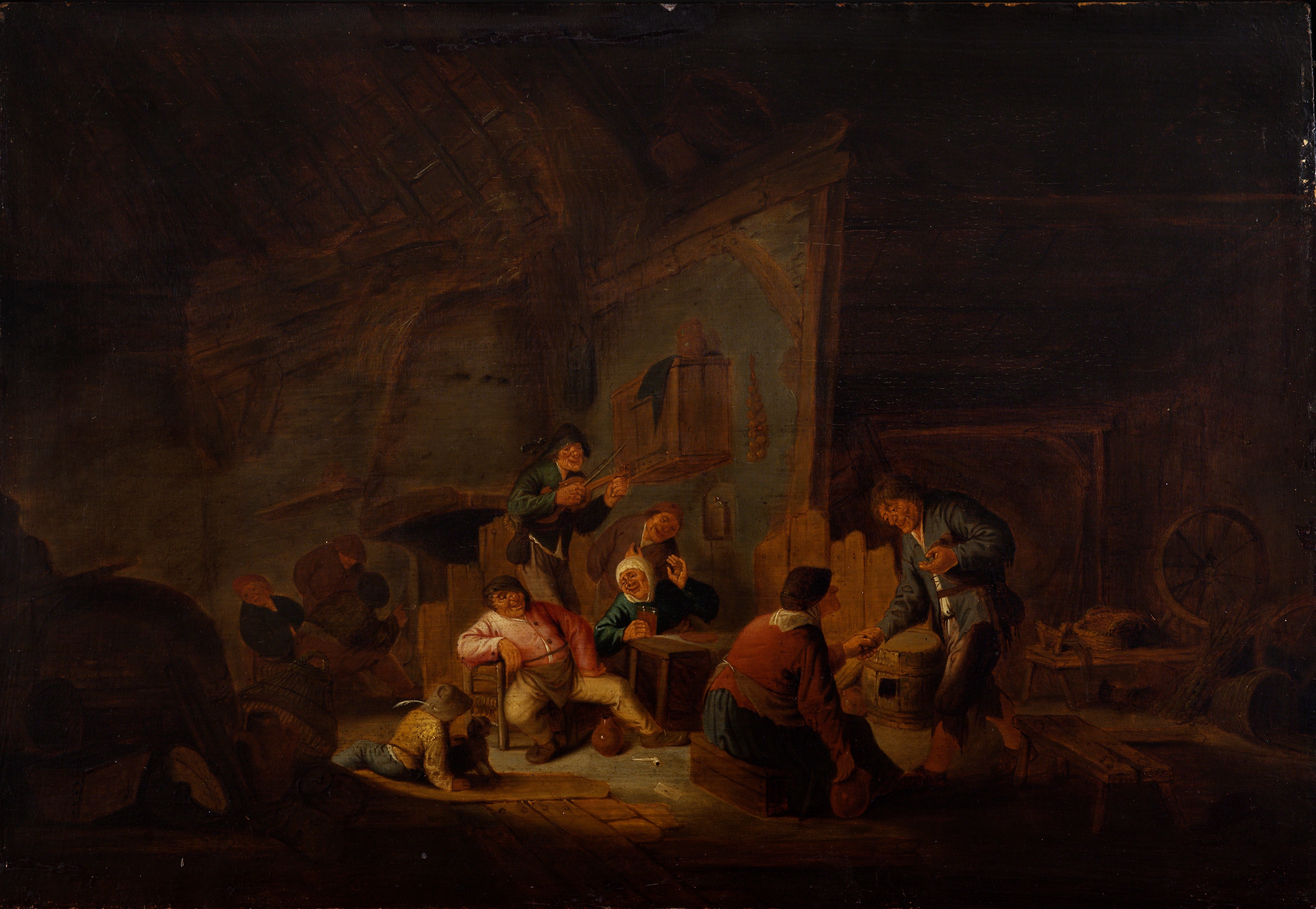 Bag dem forsøger en spillemand ihærdigt at stemme sin violin til stor morskab for manden ved siden af. En dreng sidder på det snavsede gulv og er helt upåvirket af det spektakel, der udfolder sig omkring ham. I stedet er hans opmærksomhed rettet mod gårdhunden, som han kærligt aer. Selvom kunstneren bag dette motiv er ukendt, er påvirkningen fra Adriaen van Ostades tidlige genremalerier tydelig i formsprog og indhold. Både den stærke belysning og den humoristiske skildring af enfoldige bønder i festligt lag går igen i van Ostades folkelivsskildringer fra første halvdel af 1600-tallet.