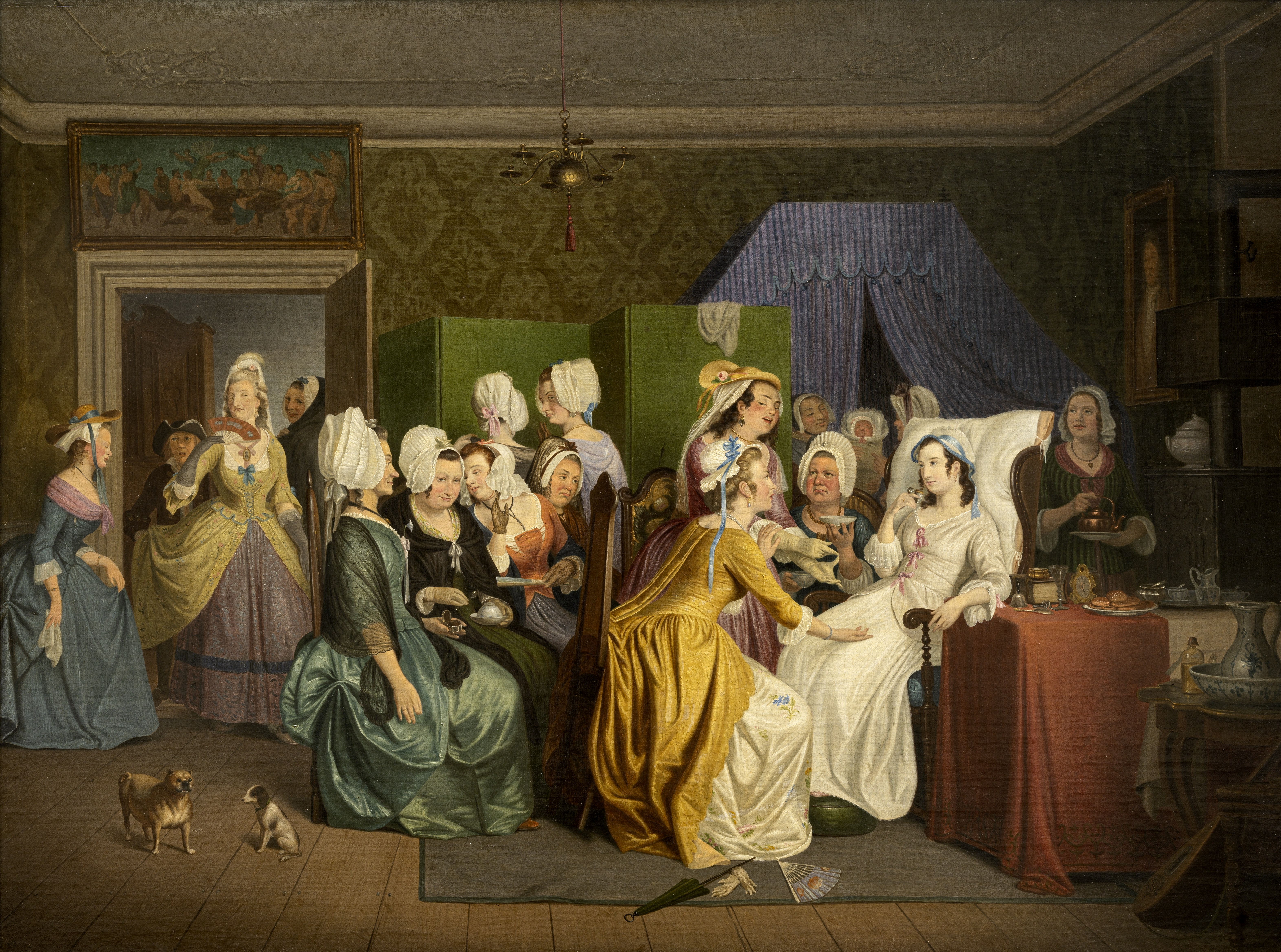 Placeret i en højrygget lænestol med en stor pude i ryggen sidder den nybagte mor og modtager besøg og gaver fra bekendtskabskredsens fruer, som det var skik og brug på Holbergs tid. En tradition, der stod på i flere uger. Værket er et nysgerrigt kig ind i en af borgerskabets stuer, hvor man samtidig bliver tilskuer til en række små interne handlinger, og udvekslinger af blikke, figurerne imellem.