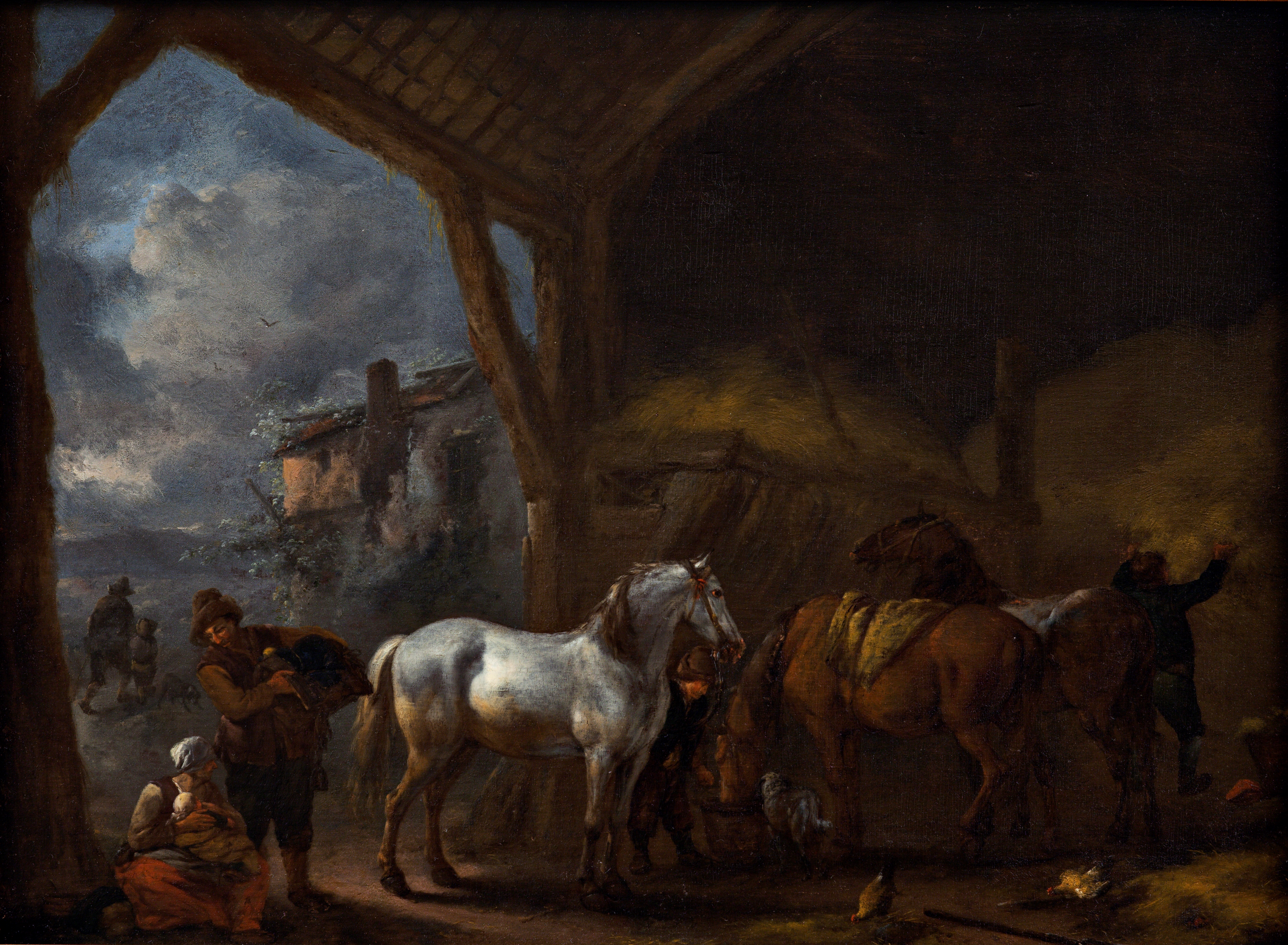 En dreng fører en hvid hest ind i stalden, mens det trækker op til stormvejr udenfor. I stalden står en brun hest og drikker af en spand, mens en staldknægt nedtager hø. I baggrunden begiver en mand med en dreng sig ud i uvejret. Selvom Philips Wouwerman først og fremmest var kendt som landskabsmaler, blev han i sin samtid også anerkendt for sin unikke evne til at skildre heste med stor præcision og nøjagtighed. I hans malerier af rejsestalde kommer nærstudiet af hestens anatomi og bevægelsesmønstre for alvor i fokus, mens det omgivende landskab ofte blot danner den ydre ramme for fortællingen. Motiverne kan således i høj grad ses som selvstændige dyrestudier fremfor egentlige landskabsmotiver. I dette maleri står den hvide og brune hest også centralt fremme i kompositionen, mens det dystre landskab er med til at give maleriet en vis dybde og stemning.